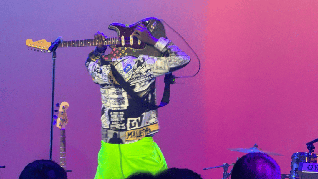 Wyclef Jean plays his Louis Vuitton embossed guitar behind his head at Money 20/20